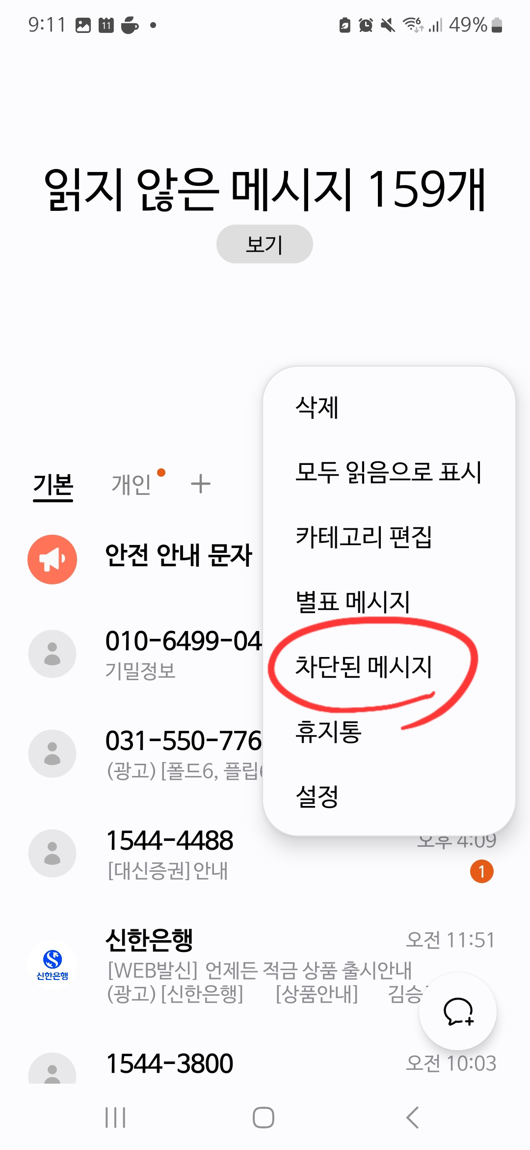 문자 앱에서 차단된 메시지에 들어가보면 실제로는 문자가 도착했으나 나에게 보이지 않는 경우가 있다.