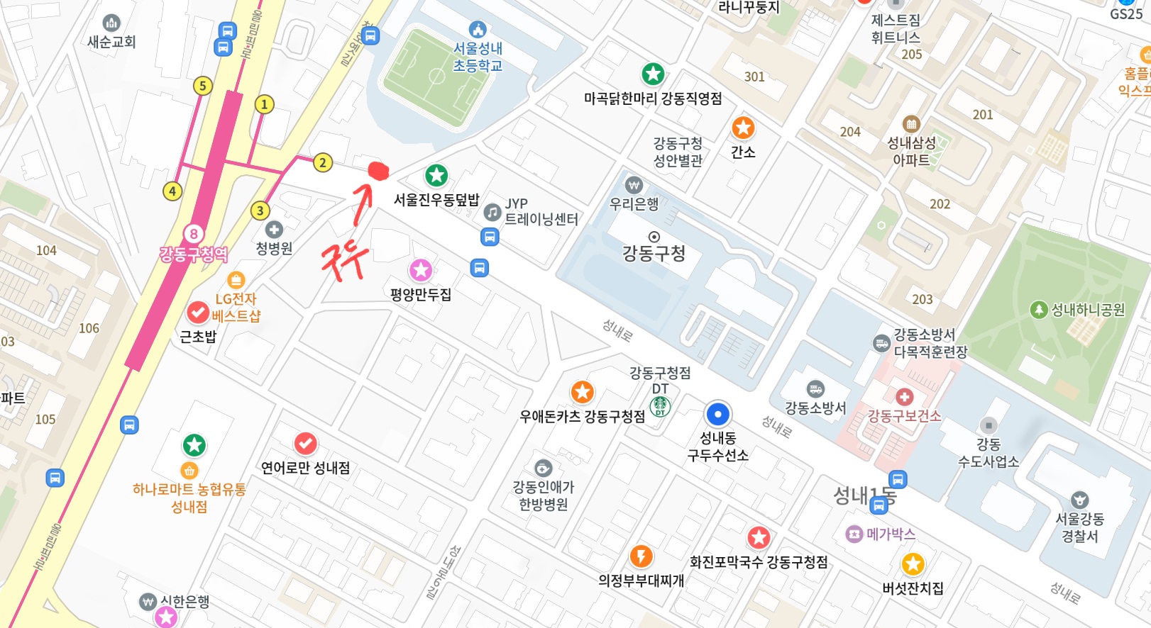 강동구청역 근처에는 구청을 중심으로 한 수도사업소, 소방서, 경찰서, 주민센터 등 여러 기관과 더불어 사기업들이 있다. 비즈니스 미팅이 많기에 구두는 필수적이므로 바쁠때는 구두닦이 점을 이용하자.