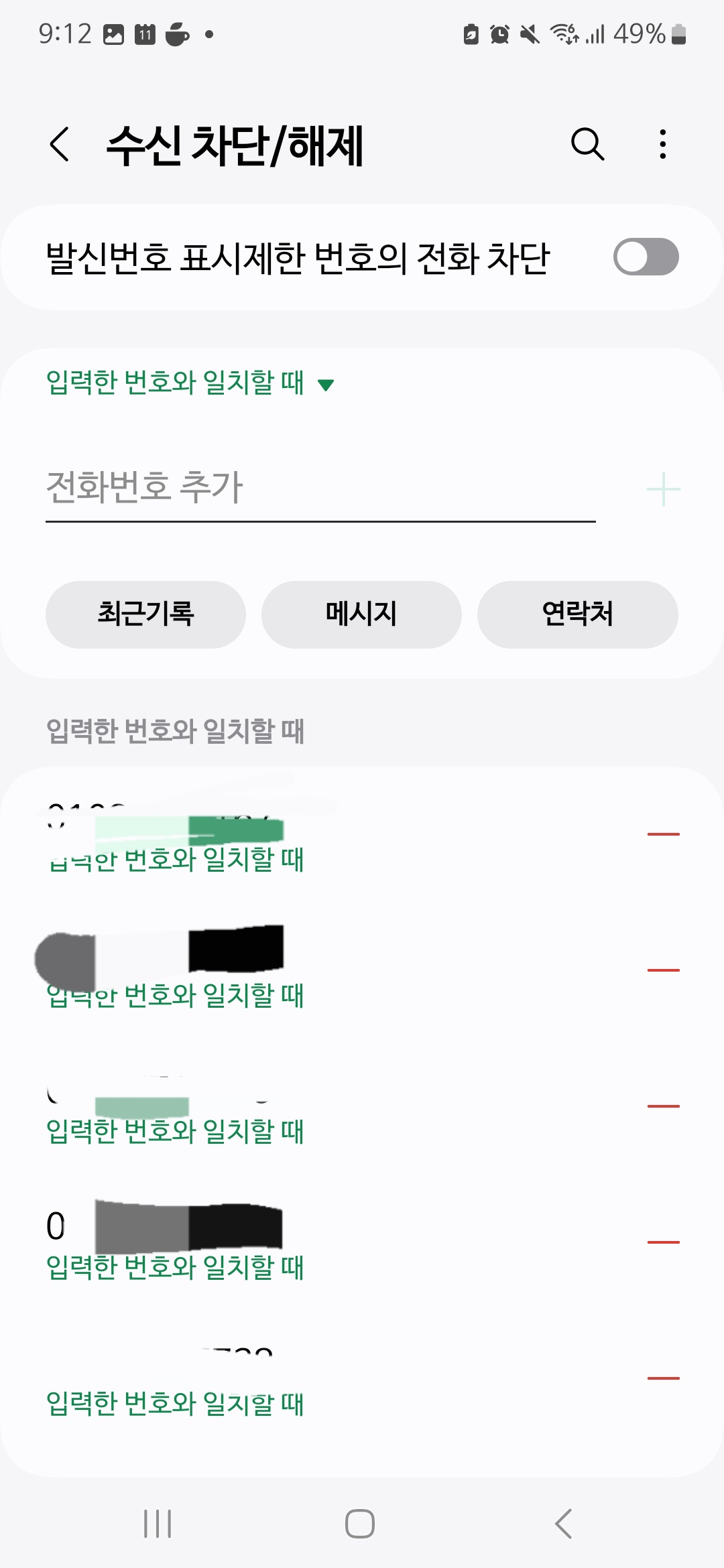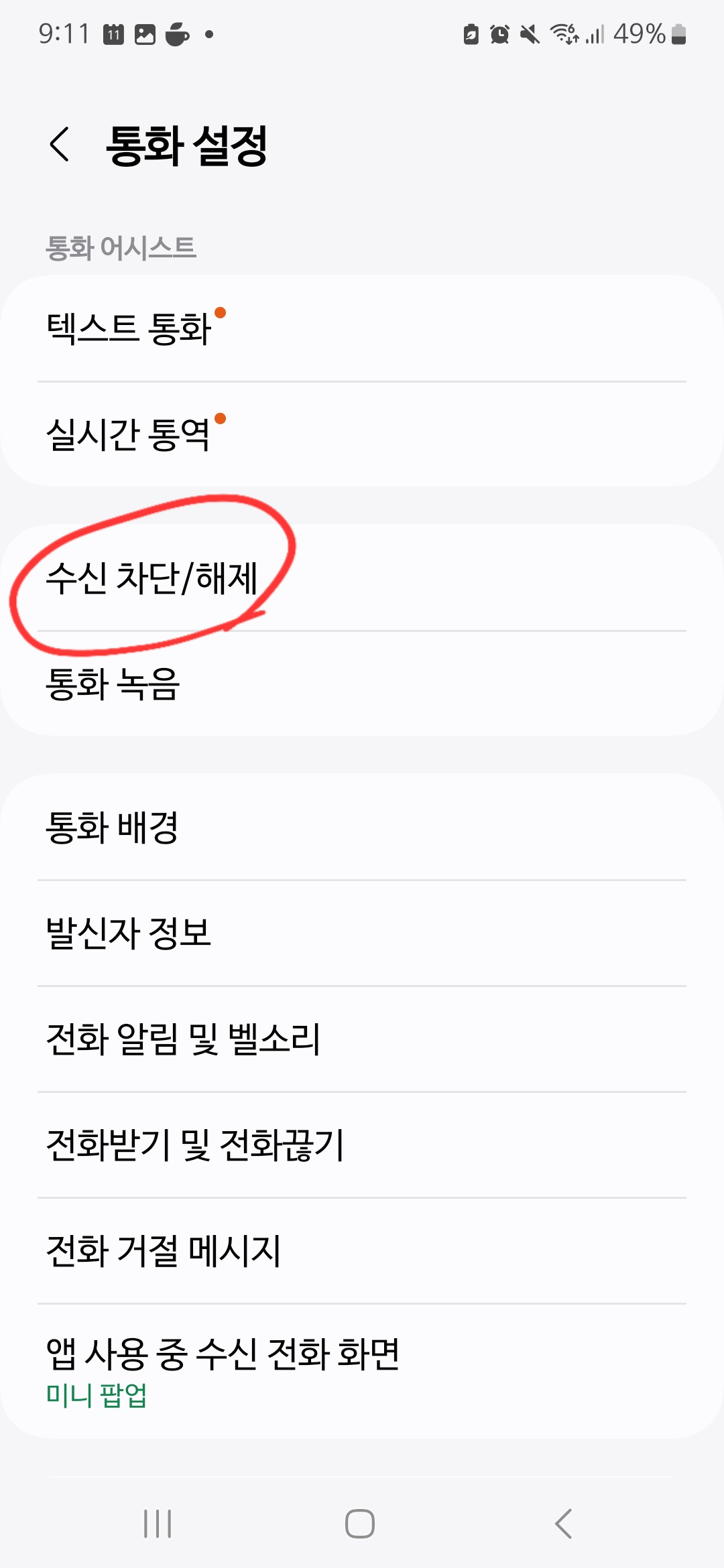 설정 - 통화설정 - 수신차단/해제로 들어가면 내가 차단한 전화번호들을 볼 수 있다.