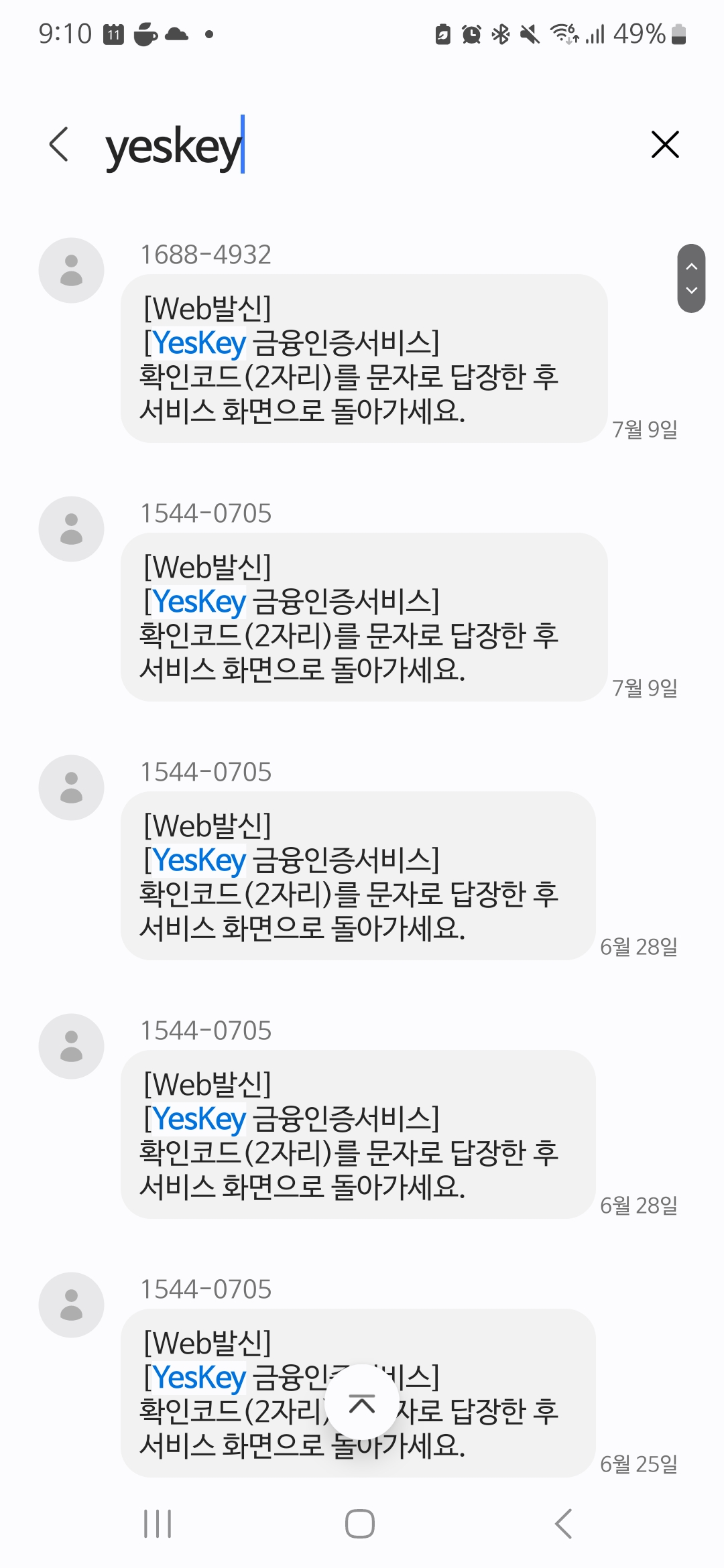 yeskey 문자가 오는 번호는 1688-4932 혹은 1544-0705이다. 이 두 번호가 차단되어 있는지 확인해야 한다.