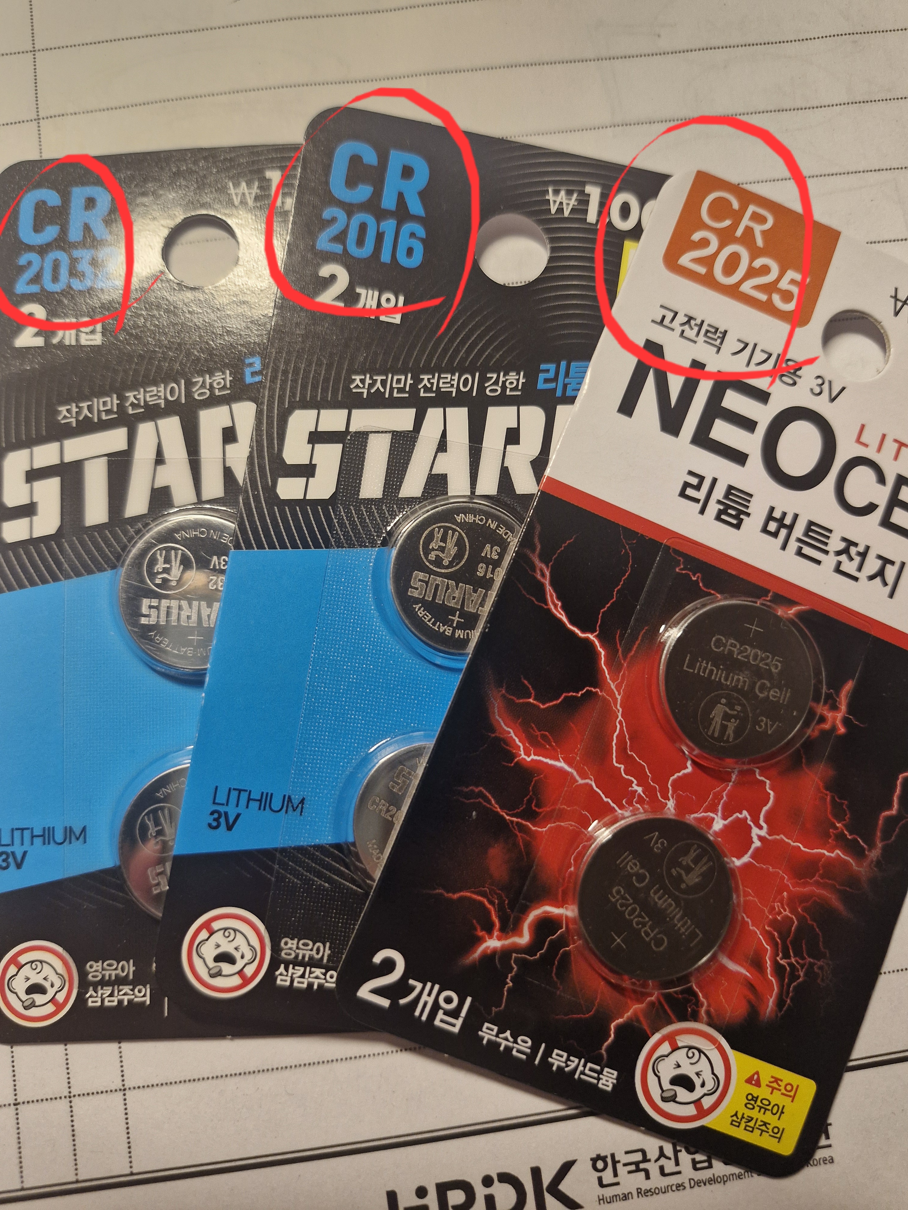- R: 배터리의 모양이 둥근(Round) 형태임을 나타냄. 흔히 '코인 셀' 또는 '버튼 셀'이라고 불리는 동전 모양의 건전지를 의미