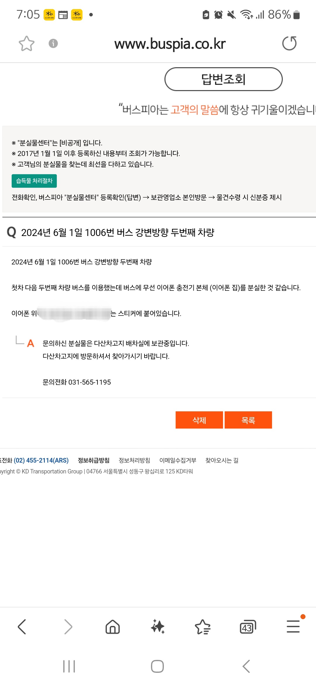 다행히 운수업체 고객센터에서 답변을 달아주었다. 누가 가져가지 않고 버스 좌석에 그대로 있었나보다. 사실 이어폰까지 안에 있었다면 분실이 될 우려가 컸지만, 안에 이어폰은 내 귀에 꽂혀있었기에 본체를 들고 가지는 않았다. 다행히 이어폰을 하나 더 사야하는 불상사는 일어나지 않았다. 대원고속 운수업체 관계자 분께 감사의 말씀을 드립니다.