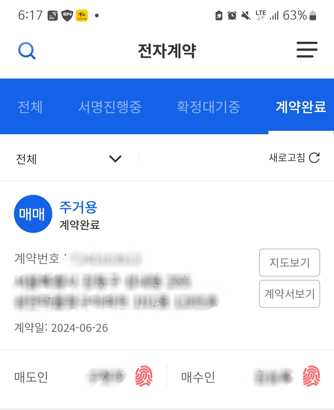 매수인, 매도인 서명이 완료되면 매도인, 매수인 옆에 지문이 빨갛게 활성화 된다. 서명을 했다는 거다. 그리고 중개사의 확정까지 되면 계약완료라고 뜨게 된다. 이러면 계약 끝!