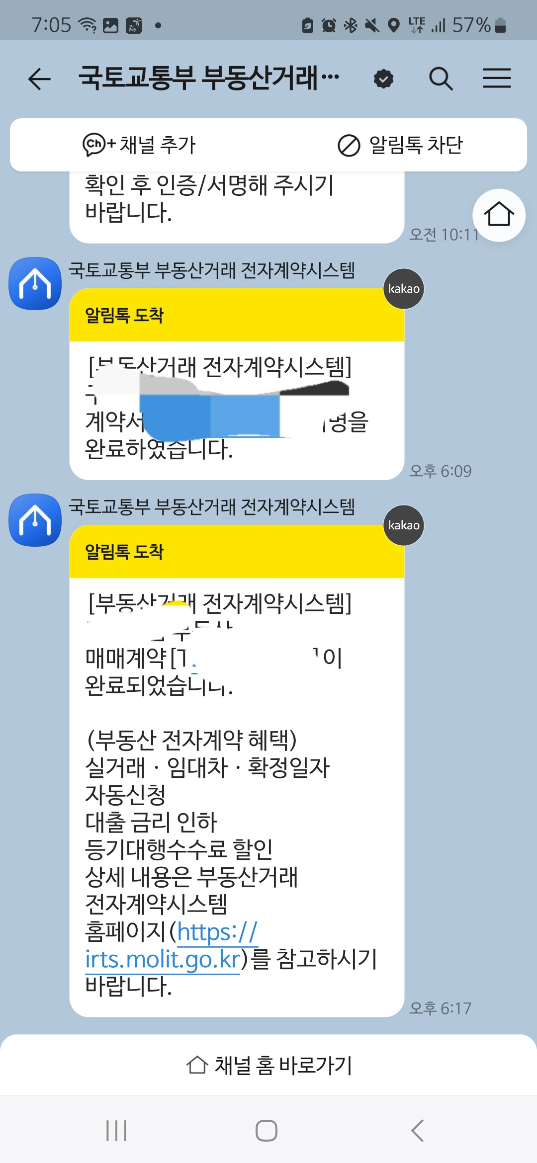 매수인, 매도인 모두 서명을 하면 위와같이 국토교통부에서 카톡이 날라온다. 참고로 매수인, 매도인 서명 후 중개사가 확정을 해주어야 계약완료가 된다. 계약완료라고 카톡이 날라와야 진짜 계약이 된거다. 매수인 매도인 서명만으로 끝내면 안된다.