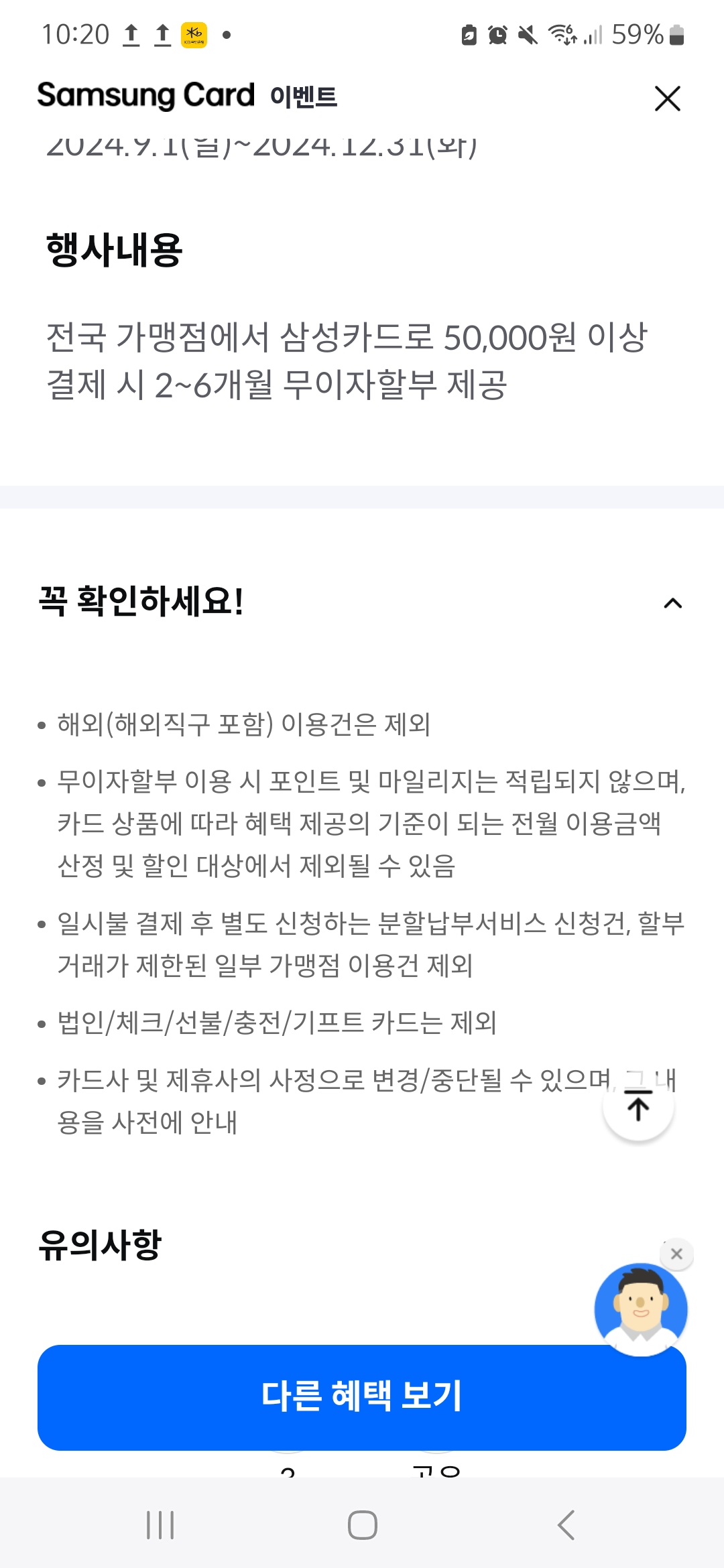 위 이벤트는 24년 9월 25일 필자가 직접 확인한 것이다. 생각보다 이벤트가 꽁꽁 숨겨져 있다. 아무래도 무이자할부는 카드사에게는 불리한 혜택이니 일부러 고객들에게 잘 공개를 안하는 것이다.