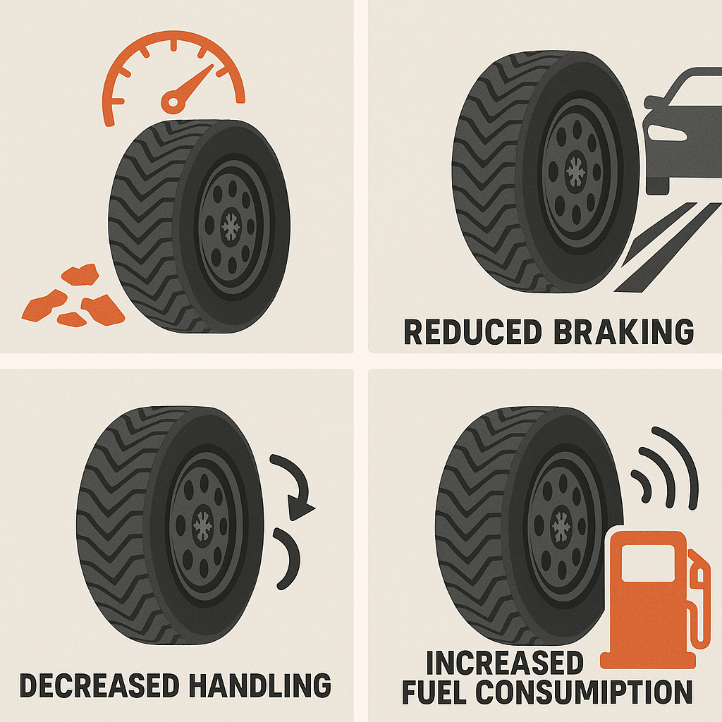 * 높은 구름 저항: 스노우 타이어는 접지력을 높이기 위해 트레드 블록이 더 많고, 표면적이 넓어 구름 저항이 높다. 여름철에 이를 사용하면 불필요한 마찰로 인해 연비가 떨어지고 연료 소비량이 증가한다.