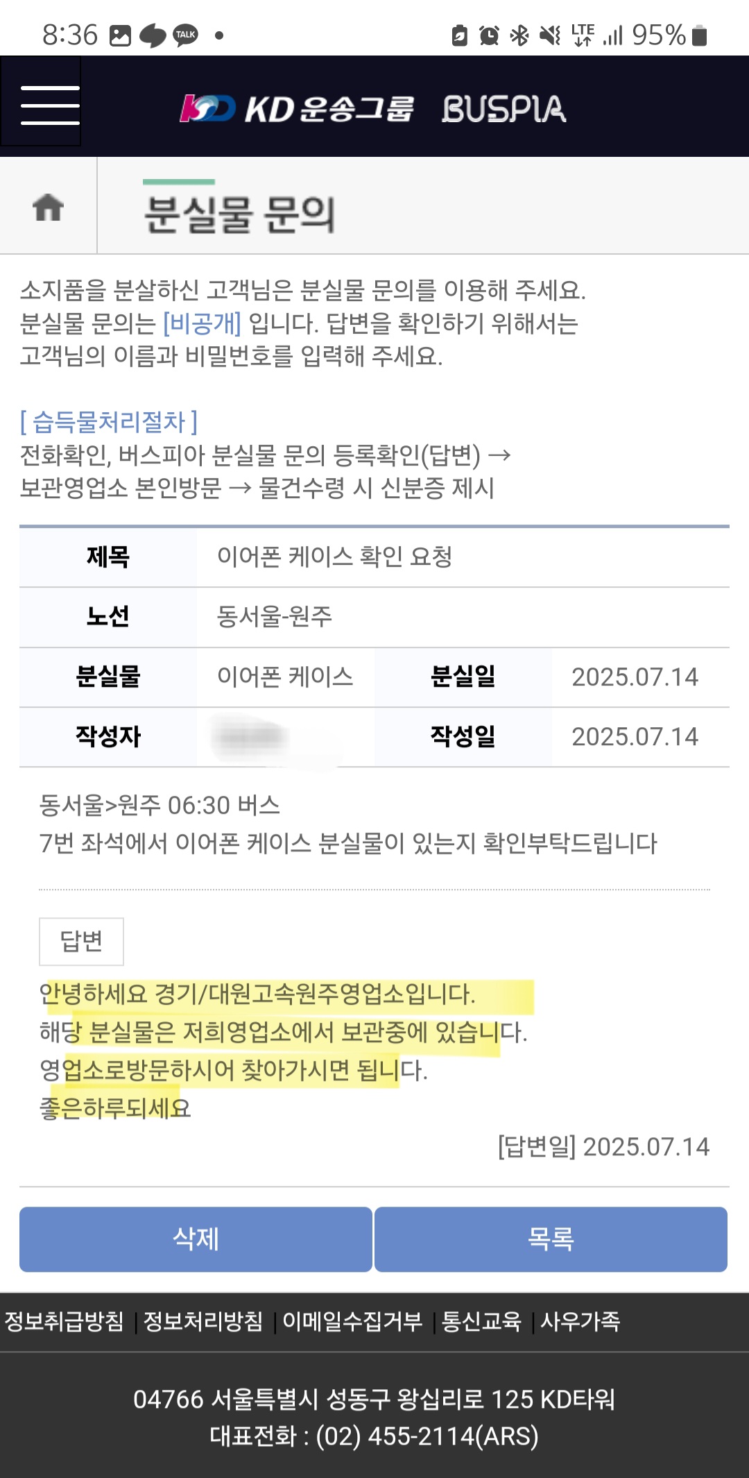 버스에서 이어폰을 잃어버렸다는 걸 알고 바로 경기고속 사이트에서 분실물 문의를 했고 생각보다 빨리 답변이 왔다. 다행히도 원주터미널 경기고속 사무실에서 보관중이라고 한다. 그래서 바로 찾으러 가는데 처음 가보는 사람들은 해맬 수 있어서 위치를 알려주고자 한다.