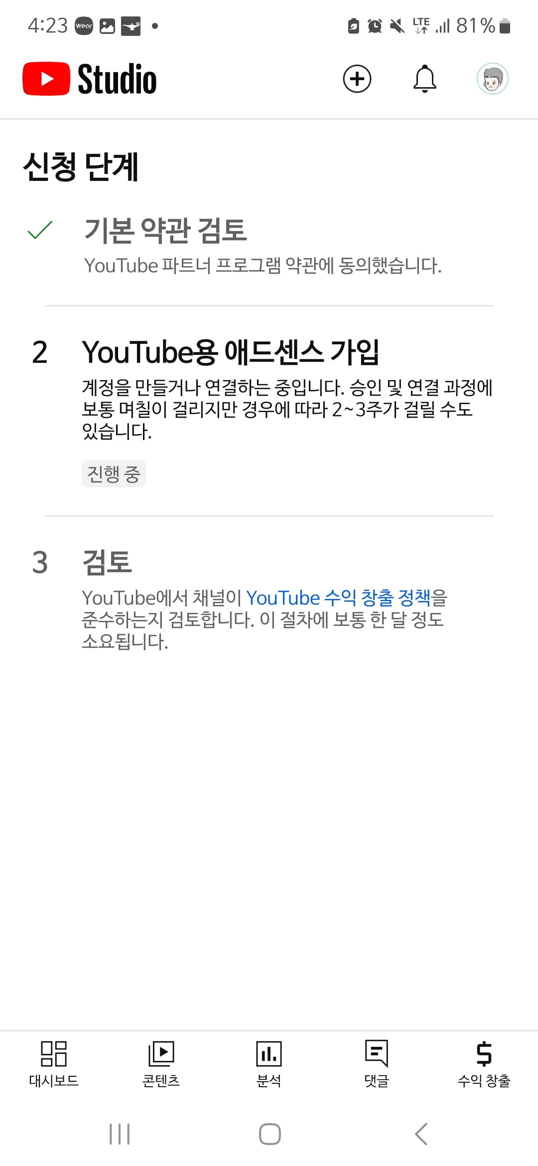 채널의 적정성도 통과가 된 듯 하다. 선정성이나 부적절한 영상으로 구독자를 확보한 경우에는 승인해주지 않을 수도 있을 것 같다. 나의 경우에는 기술사 공부관련 내용을 올리기 때문에 적정성면에서는 문제가 없었던 것으로 보인다.