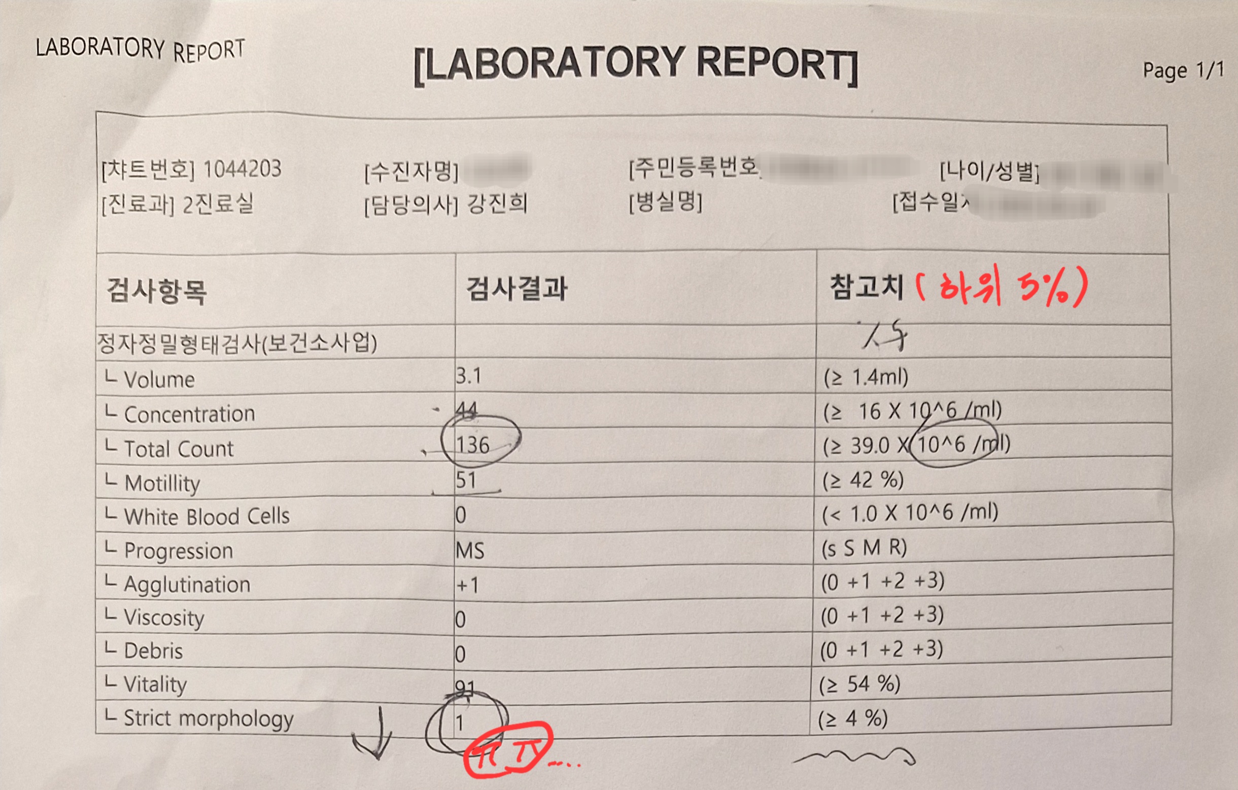 다 좋은데 Strict Morphology가 생각보다 너무 낮다. 물론 정자의 수가 워낙 많긴 하지만 그래도 비율이 낮은 건 좀 아쉬운 부분이다. 요즘 공부하느라 스트레스도 받고 수면시간도 부족한게 영향을 주지 않았나 싶다. 잠을 잘 자자.
