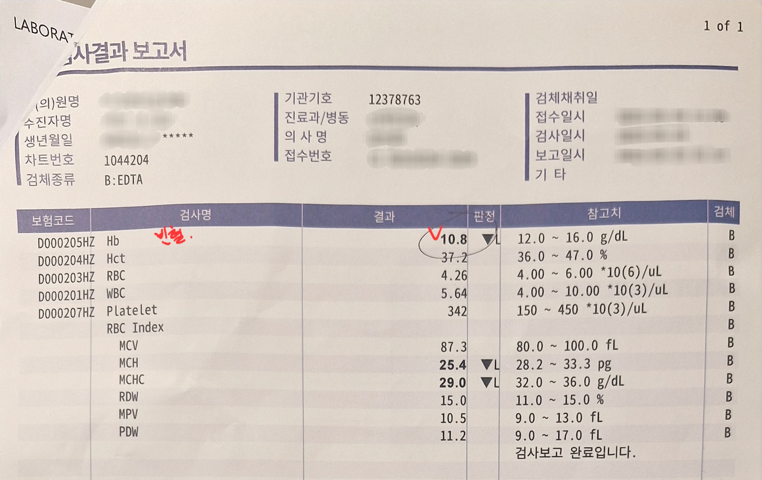 Hb 수치가 약간 낮고, Hb 수치가 낮은 이유는 MCH, MCHC가 낮기 때문인 것으로 보인다. 의사가 철분제를 처방해 주었다. 철분제 잘 먹어야지.