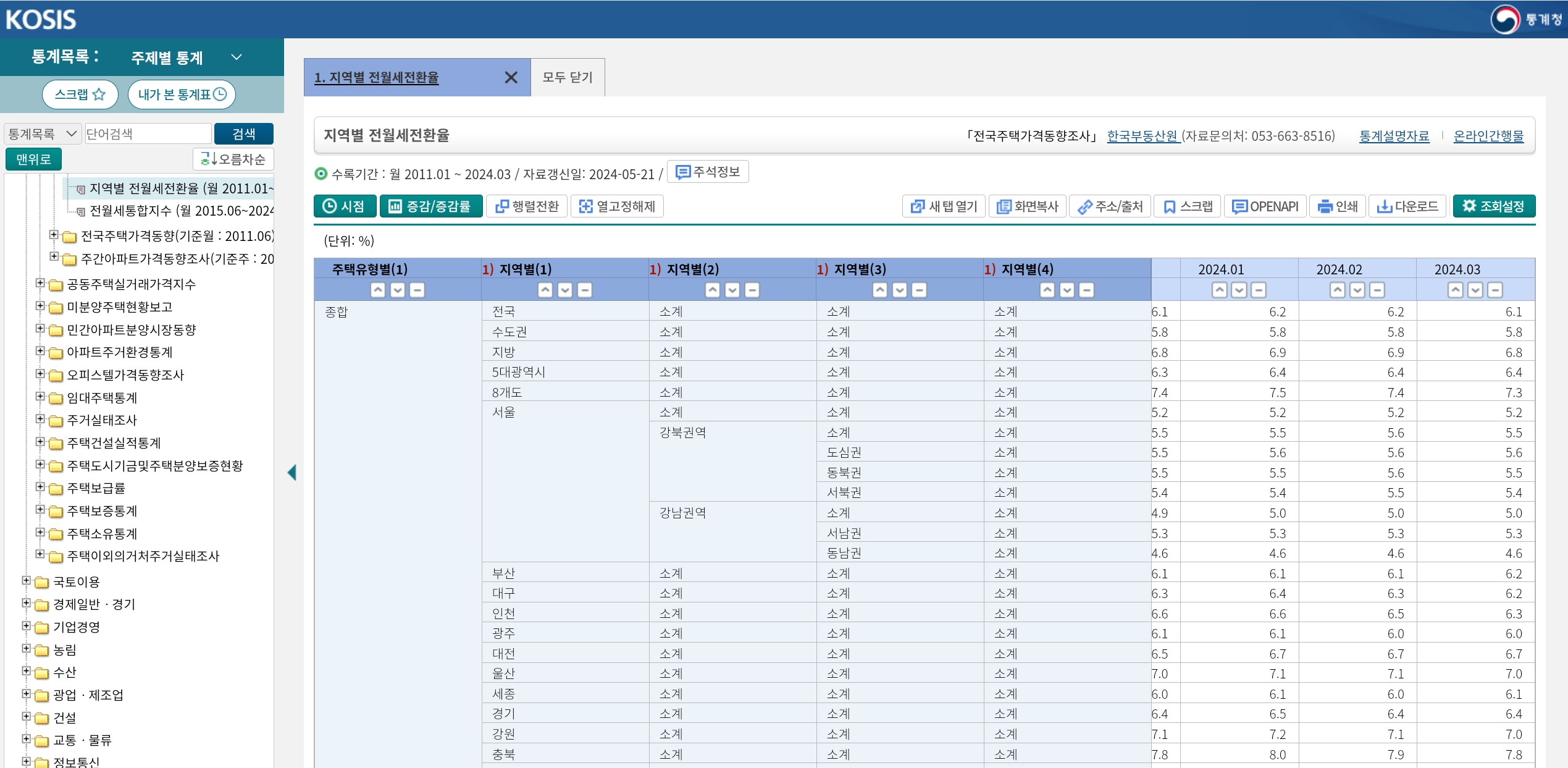 위 표는 주요 지역들의 전월세 전환율 평균을 나타낸 것이다. 2024년 3월 현재 5%에서 왔다갔다 한다.