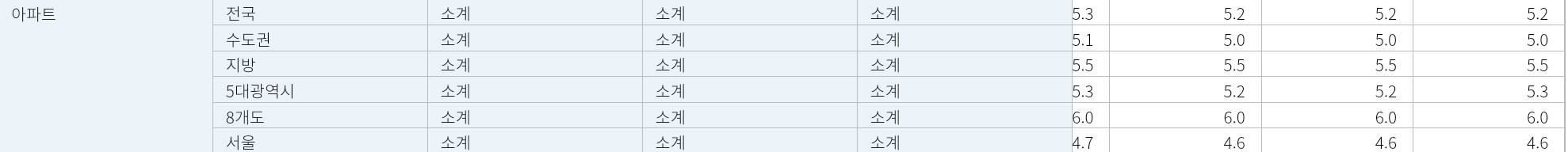 위 표는 주요 지역들의 전월세 전환율 평균을 나타낸 것이다. 2024년 3월 현재 5%에서 왔다갔다 한다.