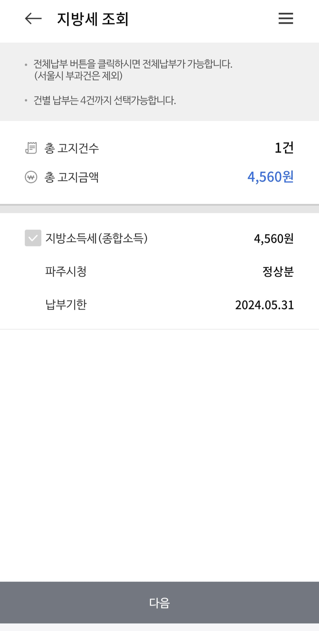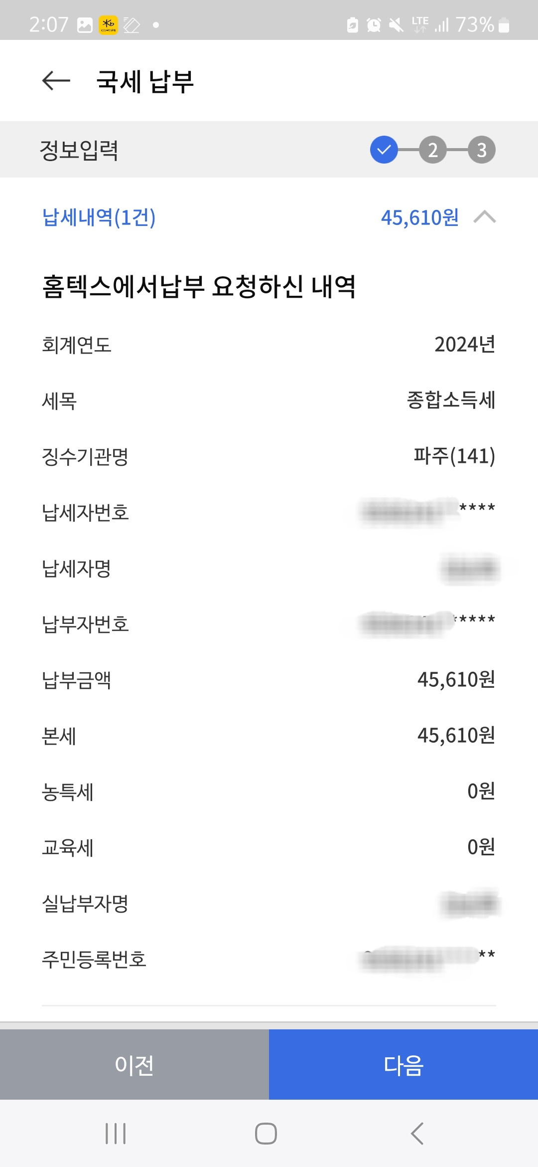 세액이 맞는지 확인하고 본인이 편한 방법으로 납부를 해주시면 됩니다. 계좌이체, 카드결제 등 여러가지 방법이 있었습니다.