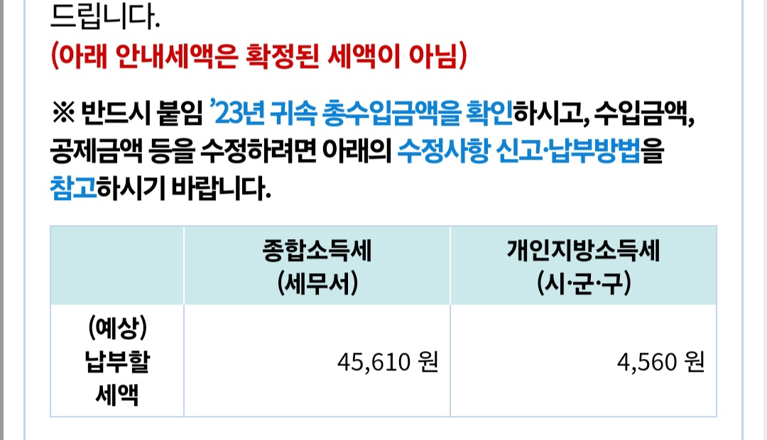 근데 카카오톡으로 날라온 종합소득세 고지서 방법에는 전화신고 후 계좌를 받으라고 합니다. 하지만 저는 이미 홈택스로 신고를 완료한 상황입니다. 홈택스 신고과 전화신고를 모두 하면 중복 부과가 될 수 있다고 하니 주의하시기 바랍니다.
