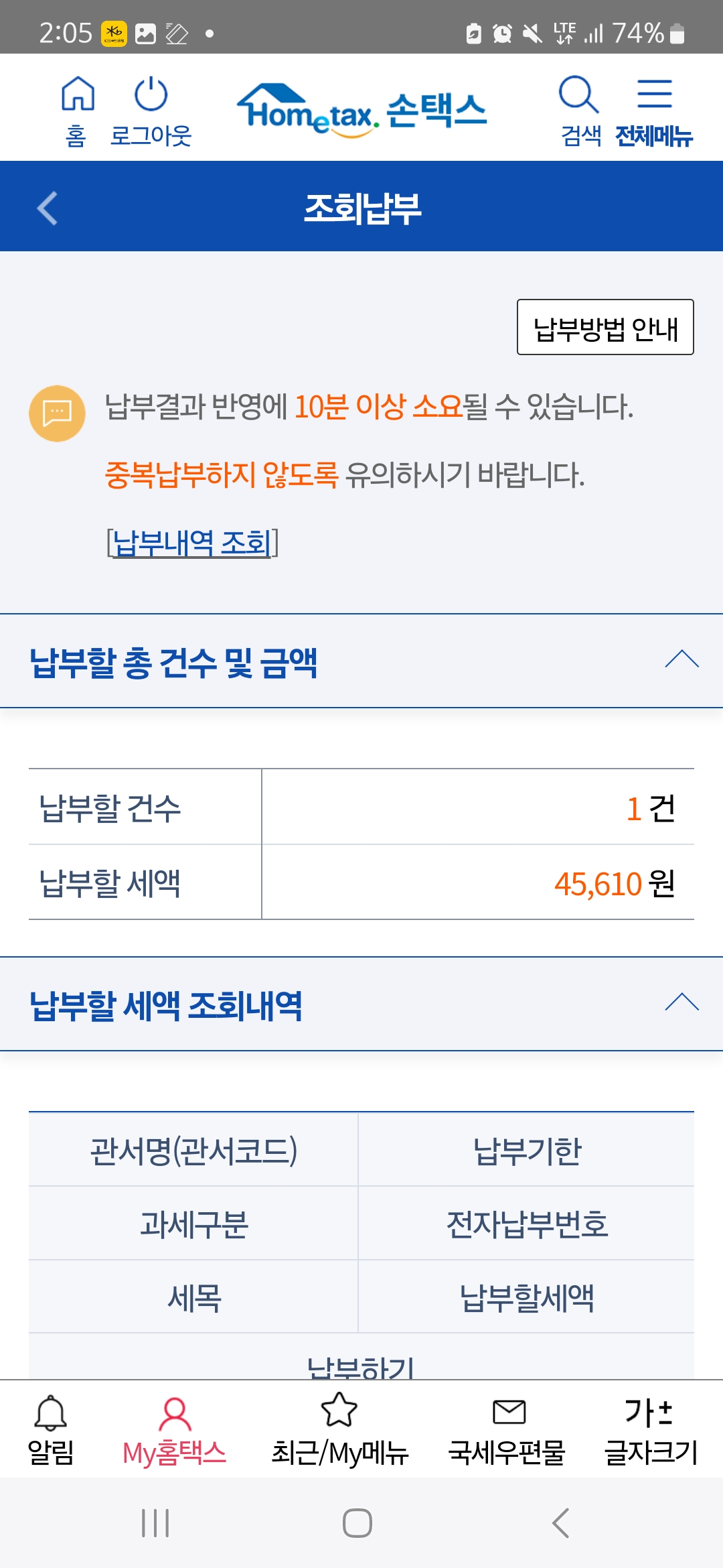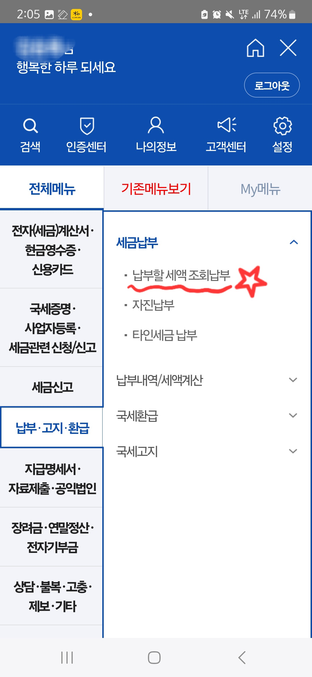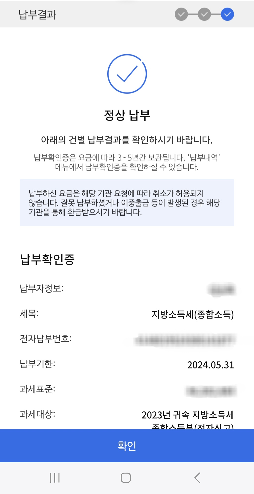 세액이 맞는지 확인하고 본인이 편한 방법으로 납부를 해주시면 됩니다. 계좌이체, 카드결제 등 여러가지 방법이 있었습니다.