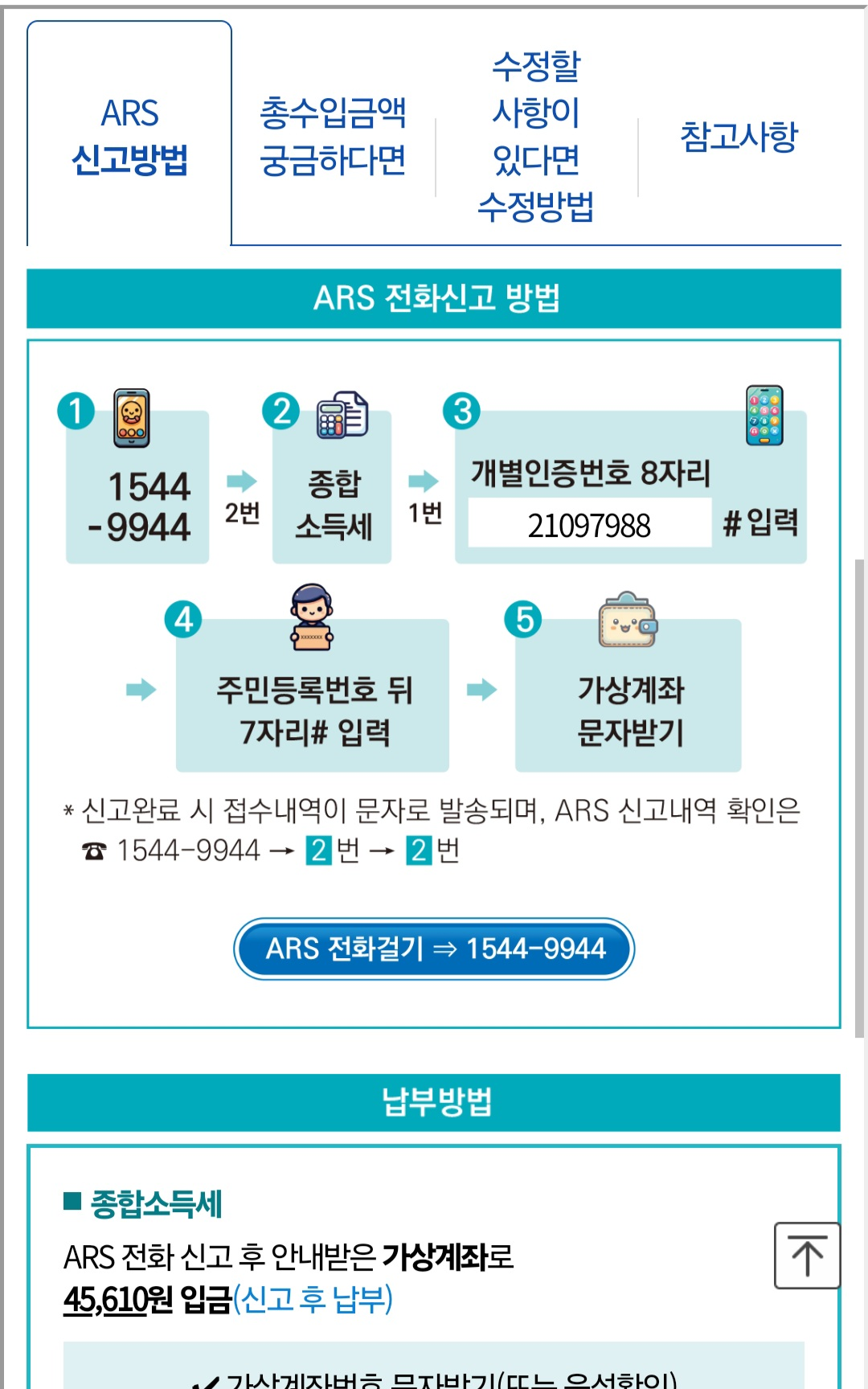 근데 카카오톡으로 날라온 종합소득세 고지서 방법에는 전화신고 후 계좌를 받으라고 합니다. 하지만 저는 이미 홈택스로 신고를 완료한 상황입니다. 홈택스 신고과 전화신고를 모두 하면 중복 부과가 될 수 있다고 하니 주의하시기 바랍니다.