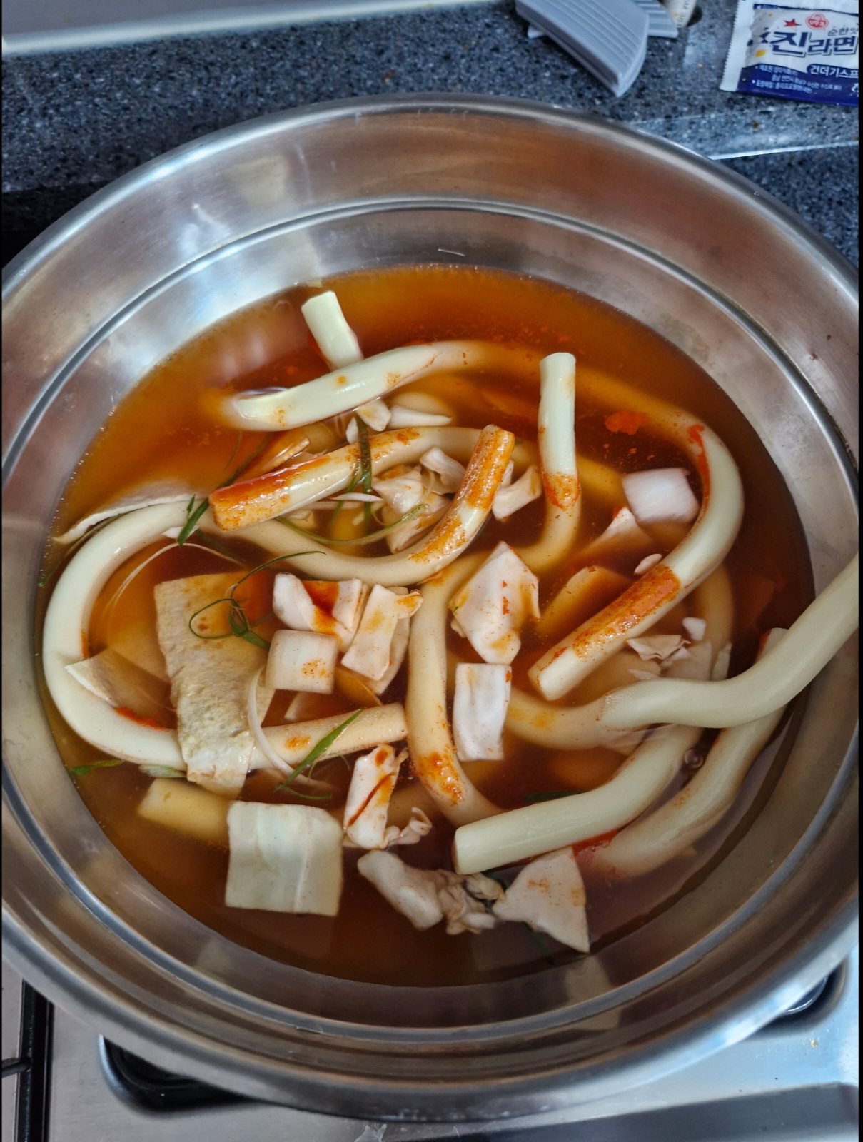 파와 라면은 따로 떡과 라면은 물 4컵 넣고 끓인다