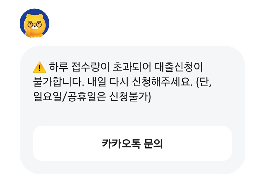 카카오뱅크 주택담보대출 신청이 워낙 많이 밀려있다. 카톡 챗봇으로 위 문자를 보면 좀 화가 난다. 대출 신청때문에 새벽에 일어나서 준비했는데 실패하다니... 나도 그랬다. (이것 때문에 예비신부와 마찰이 있기도 했다)