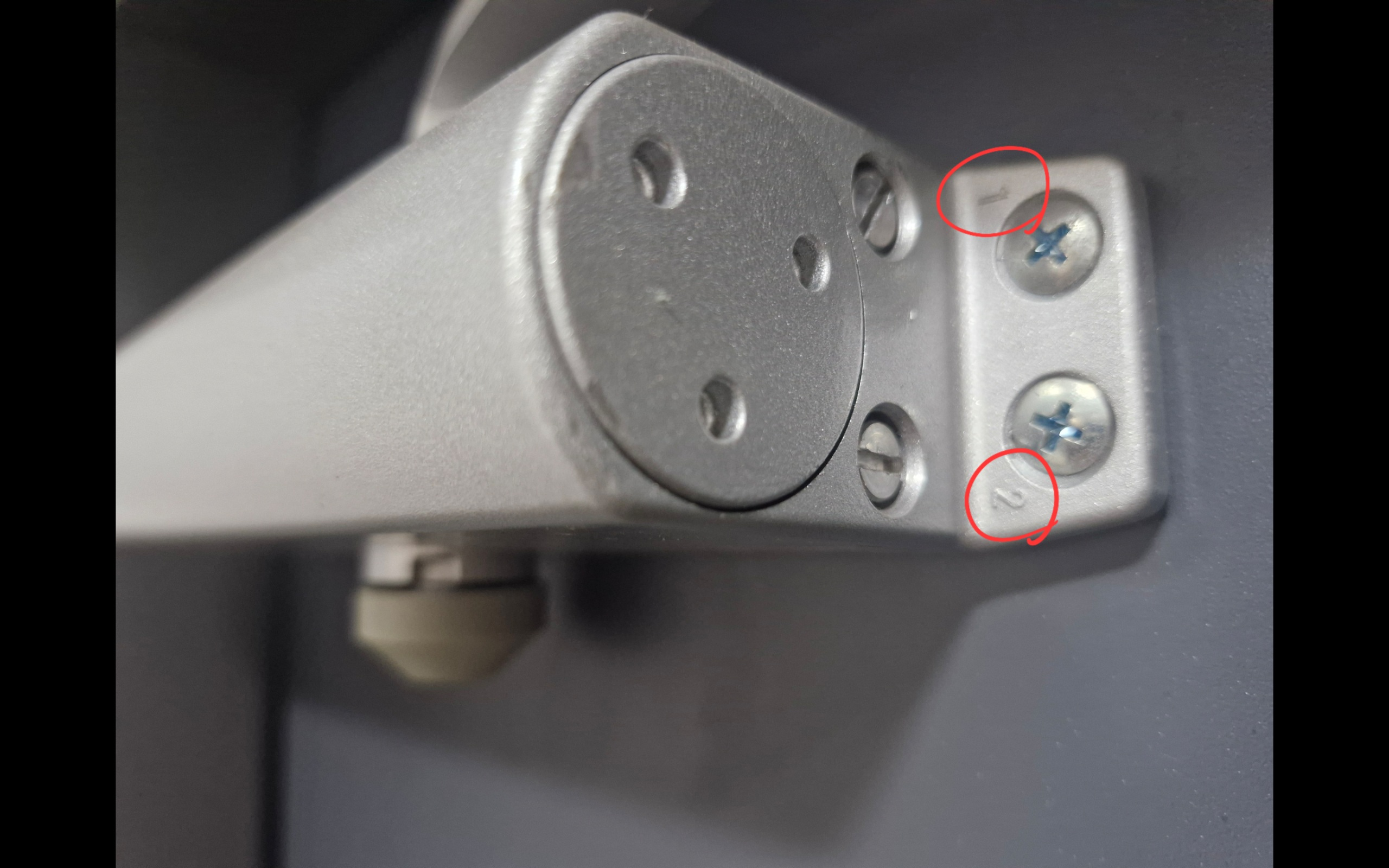 1) 도어클로저 우측에 보면 나사 두개를 볼 수 있다. 그리고 숫자 1,2가 써있다.