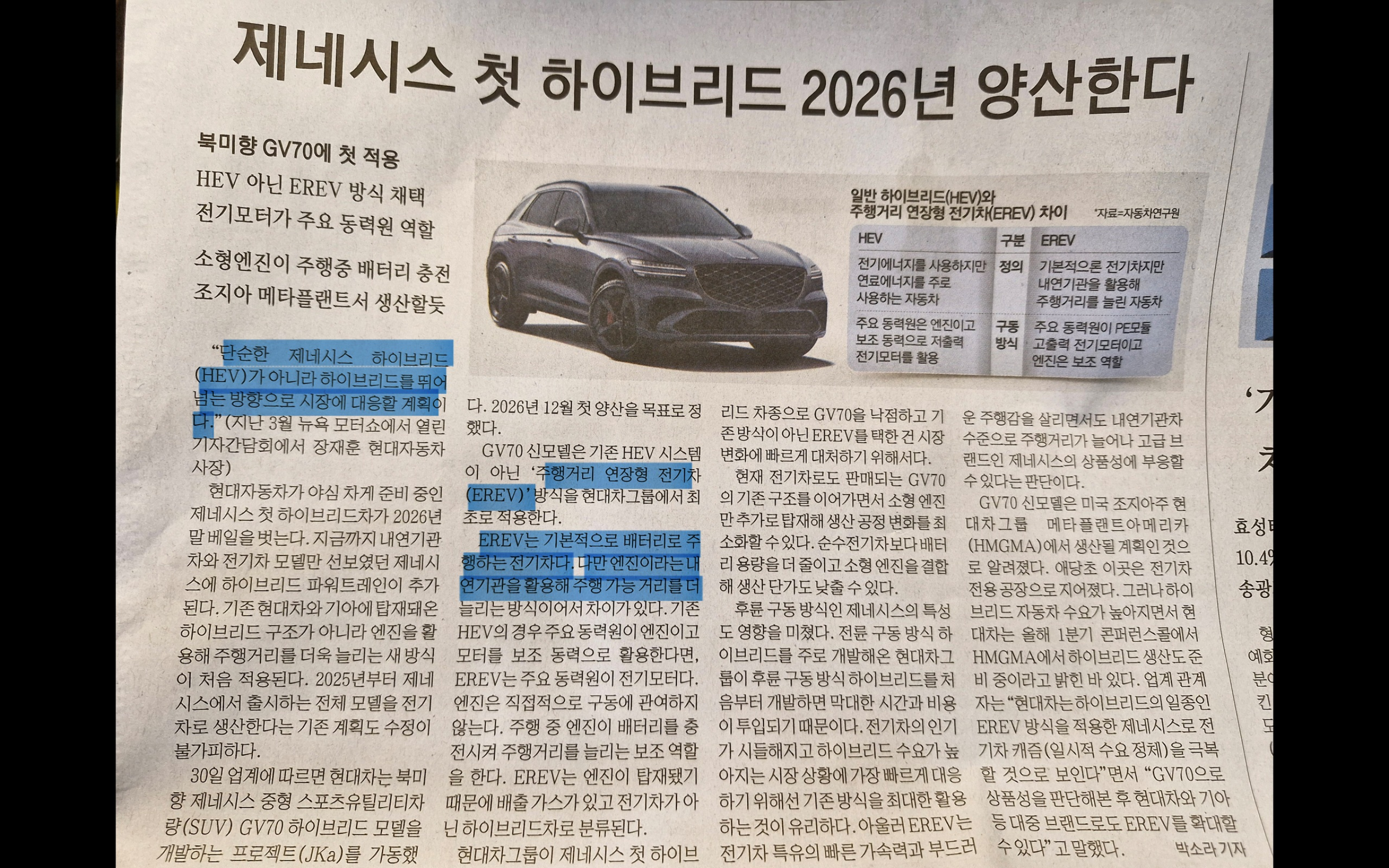 현대자동차 제네시스에서 드디어 2026년부터 하이브리드 자동차가 나온다고 한다. EREV라고 하는 하이브리드 자동차이다. EREV는 사실 엄밀히 말하면 전기차라고 봐야한다. 하지만 엔진이 들어가고 배출가스가 있기 때문에 하이브리드로 분류되긴 한다.