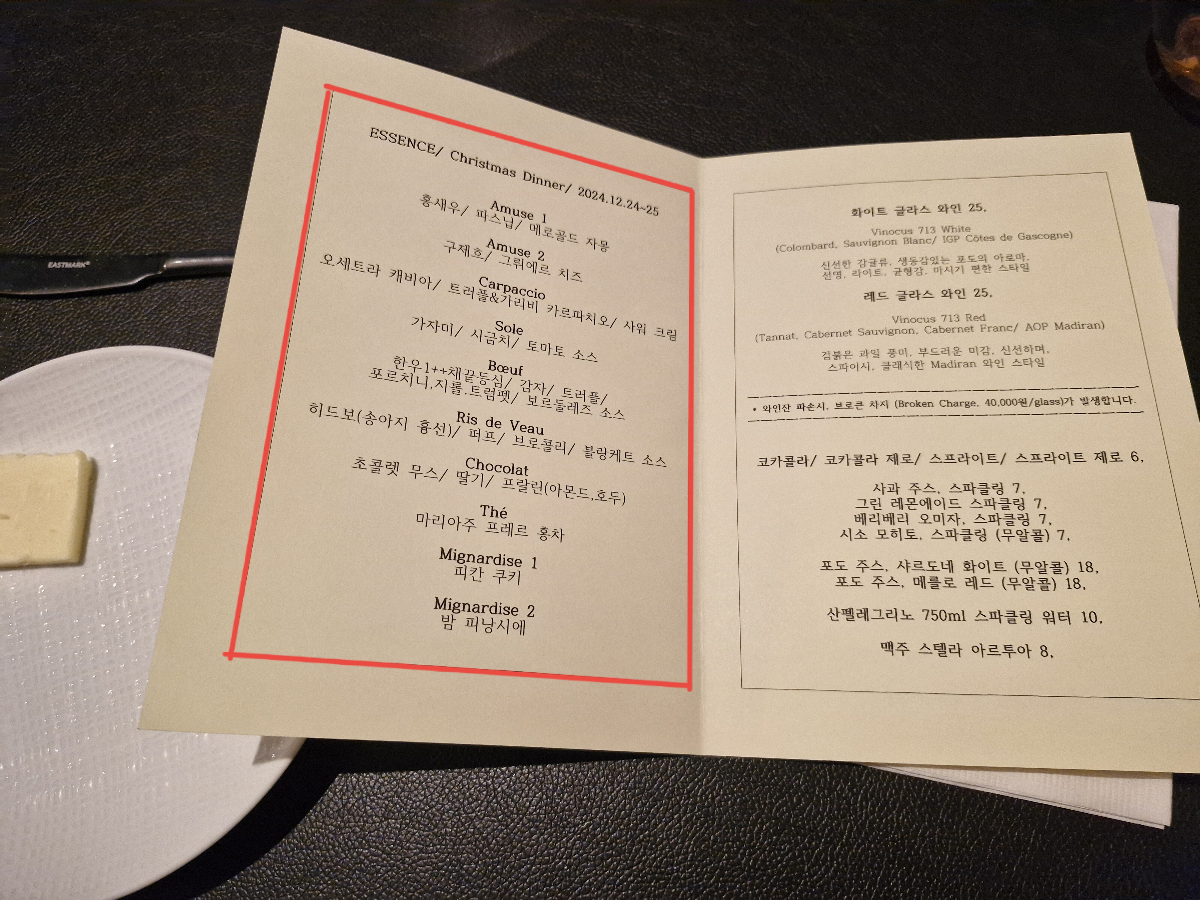 평시 에쌍스에 가면 원하는 메뉴별로 시켜서 먹을 수 있다. 하지만 크리스마스 기간(24, 25일)에는 코스요리만 먹을 수 있었다. 즉, 메뉴가 정해져 있었다. 가격이 조금 부담되기는 했지만, 그래도 크리스마스아니면 언제 올까 싶어 과감히 결제했다. (금액은 1인당 20만원 정도 생각하면 된다. 예약금도 1인당 20만원)