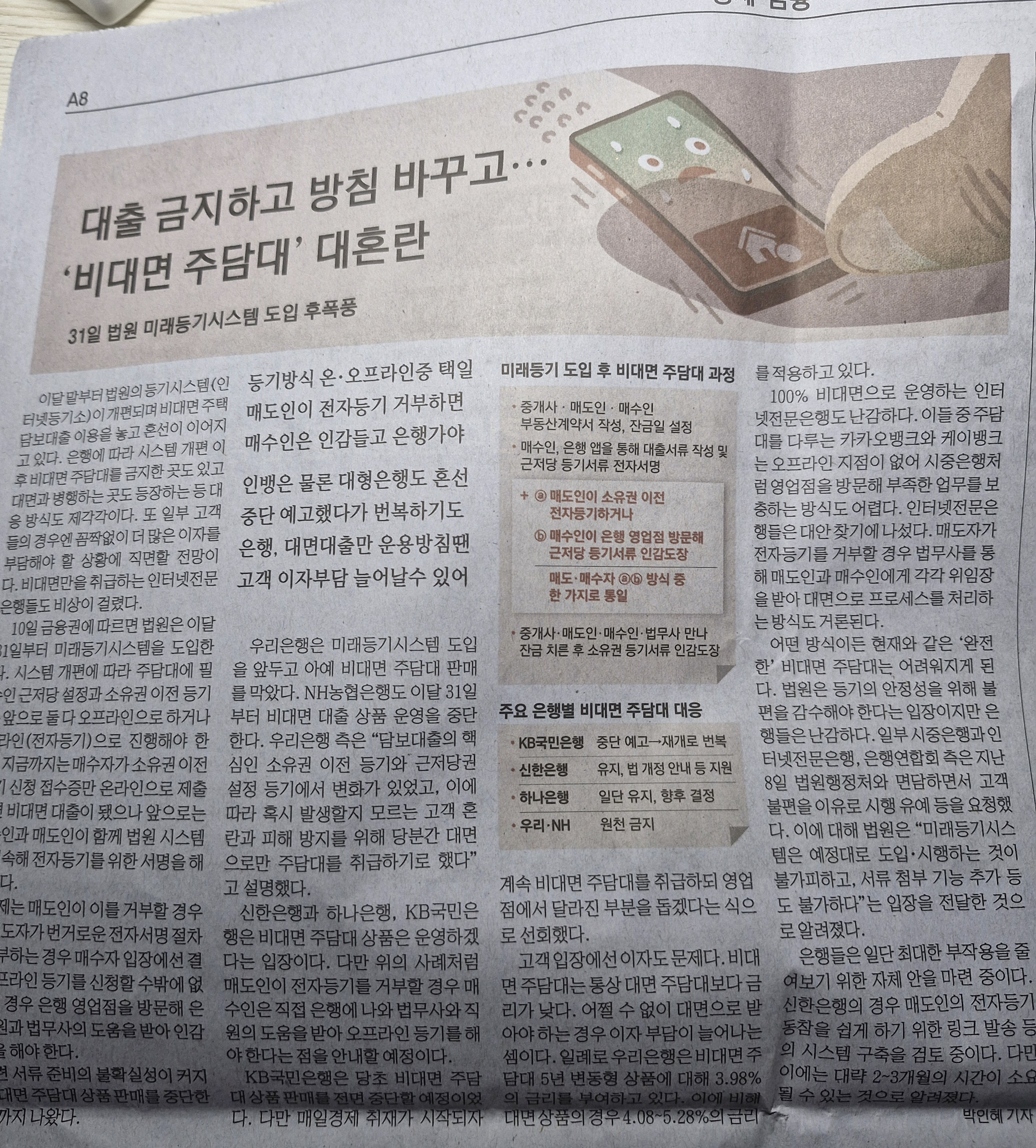 이러한 미래등기시스템 도입 강행으로 시중은행의 비대면 주담대 대출을 축소하고 있다고 한다. 도저히 은행에서도 감당이 안될거라 생각하기 때문일거다. 그러면 금리가 저렴한 비대면 주담대를 받지 못하고 금리가 높은 대면 주담대를 받아야 한다.