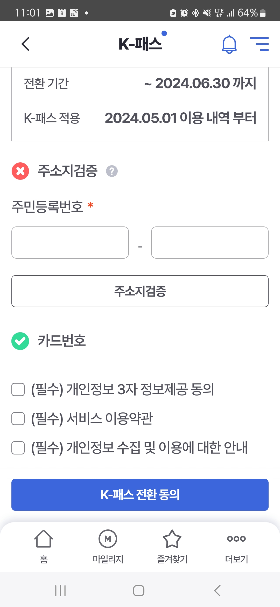 휴대폰 본인 인증까지 마치면 K 패스 전환 신청완료다.