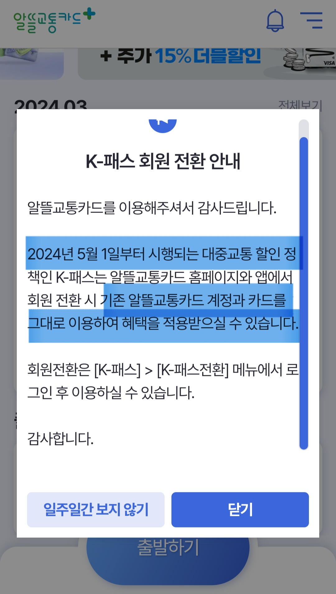 오늘도 어김없이 출근을 위해 알뜰교통카드를 사용하고자 알뜰교통카드 앱에 들어갔더니 다음과 같은 안내문구가 나왔다. 신문에서 K-패스라는 교통카드를 본 적은 있었는데, 나와는 상관없는 카드인거 같아 찾아보지 않고 있었다.